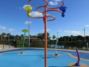 Fun splash playground and splash pad with plenty of shaded chairs for parents.