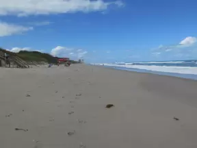 Lovely beach with thin ribbon of sand backed by high walls of dunes, and across the street, a playground with white sand and swings.