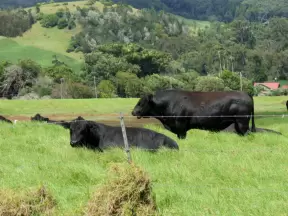 Scenic country road with hills covered in wildflowers and happy cows grazing.