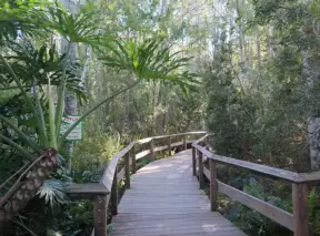 Shady, wooden boardwalk through gorgeous swamp on wide, emerald green Shingle Creek.