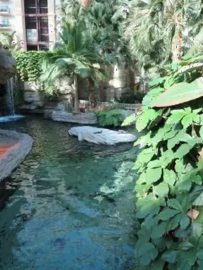 Hotel inside a giant atrium with tropical plants, fish, alligators, and decorations. ICE sculpture event in December.