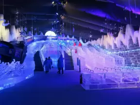 Hotel inside a giant atrium with tropical plants, fish, alligators, and decorations. ICE sculpture event in December.