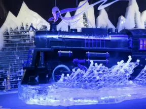 Hotel inside a giant atrium with tropical plants, fish, alligators, and decorations. ICE sculpture event in December.