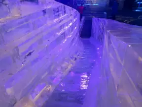 Hotel inside a giant atrium with tropical plants, fish, alligators, and decorations. ICE sculpture event in December.