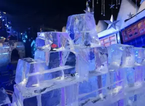 Hotel inside a giant atrium with tropical plants, fish, alligators, and decorations. ICE sculpture event in December.