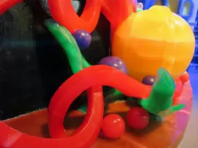 Attractive children's museum with market and carts, Newton's playhouse where you can shoot balls, ball pit, fire engine, oak tree tunnels, stage, dress-up area, and pizza kitchen.