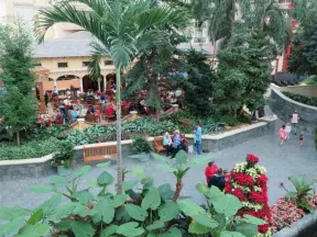 Outdoor shopping and entertainment district with European architecture, archways, palms, tropical flowers, and amazing fountain for kids.