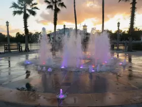 Outdoor shopping and entertainment district with European architecture, archways, palms, tropical flowers, and amazing fountain for kids.