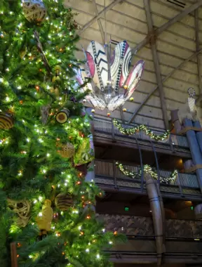 Theme park hotel with African music, tropical plants, African furniture and decorations, African items on display, and animals roaming outside the windows and outdoor viewing areas!