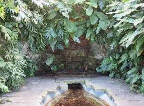 A tropical wonderland of palms, ferns, bromeliads, fountains, sculptures, rocks, ironwork gates, and pergolas, with the delightful scent of flowers filling the air.