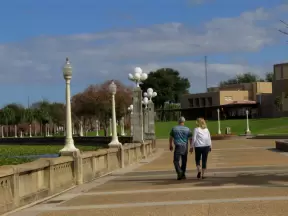 Birds sing a thousand melodies in the huge Moreton Bay fig trees while happy people stroll along the walkway at this waterfront park.