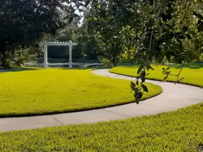 Beautiful garden with many partitioned areas, tropical plants, flowers, all with the blue lake behind. Plus, promenade around the lake.