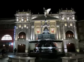 Impressive, stately building atop a hill, with lovely gardens and statues, and a fountain in the middle if the street.