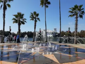 Gorgeous pool areas with splash pad and water cannons, lit up beautifully at night.