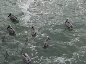 Harbor beach with hundreds of pelicans and sailboats bobbing in the water. Stunning views, seals barking on a floating dock, and outdoor cafe on Harford pier.