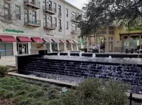 Outdoor shopping and entertainment district with European architecture, archways, palms, tropical flowers, and amazing fountain for kids.