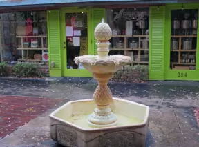 A tropical wonderland of palms, ferns, bromeliads, fountains, sculptures, rocks, ironwork gates, and pergolas, with the delightful scent of flowers filling the air.