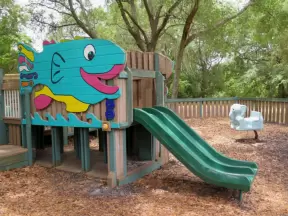 Park with plenty of benches in the shade, accessible playground with unusual equipment, tire swing, dome climby, wooden truck, dinosaur and dolphin bouncy, and plenty of swings.
