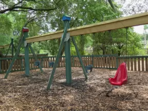 Super fun playground with merry-go-round and tons of climbing structures, all under the shade of tall trees.