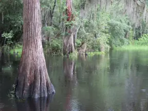 Shady white sand walking trails, and a dock on the Crooked River, with cute cypress trees and wildflowers along the path.