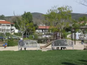 A neighborhood park with close-up views of the mountains. large lawn, playground, autumn trees, and bridge over creek to school.