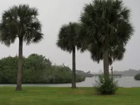 Tropical paradise with amazing trees, soft green grass, and woven huts shading picnic tables with BBQs that line the river, plus bike and kayak rentals. Beware alligators.