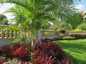 Beautiful garden with many partitioned areas, tropical plants, flowers, all with the blue lake behind. Plus, promenade around the lake.