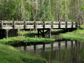 Shady white sand walking trails, and a dock on the Crooked River, with cute cypress trees and wildflowers along the path.