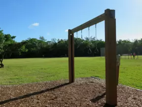 Large field with sweeping views, playgrounds, workout stations, picnic pavilions, and walking path around the field.
