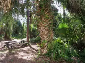 Tropical paradise with amazing trees, soft green grass, and woven huts shading picnic tables with BBQs that line the river, plus bike and kayak rentals. Beware alligators.