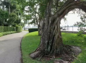 Gorgeous walk under banyan trees past side streets with lush gardens and mansions.