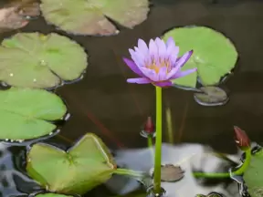 Lush paradise with water lilies galore, rustling bamboo, stone bridge, tropical flowers, strangler fig, and a gorgeous royal palm grove.