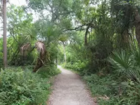 Tropical paradise with amazing trees, soft green grass, and woven huts shading picnic tables with BBQs that line the river, plus bike and kayak rentals. Beware alligators.