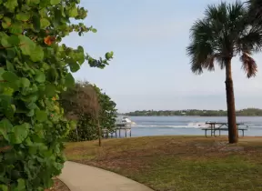 Pretty park along the intracoastal waterway near high rises, with walking paths, playground, gazebos, fountain, and tennis courts.