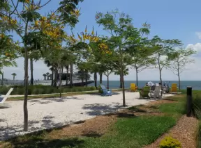 Pretty park along the intracoastal waterway near high rises, with walking paths, playground, gazebos, fountain, and tennis courts.