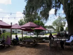 Upscale, colorful plaza in farmhouse style, with modern cafes. Kids climb on a huge log. The fire pit is fantastic at night, surrounded by eucalyptus trees.