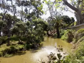 Small, gorgeous park with old trees, tropical plants, flowers, roses, and a pond with koi and turtles.