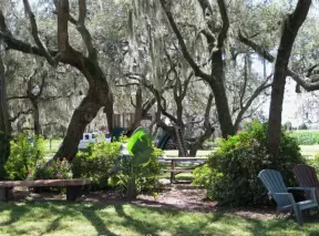 Short walk around shimmering lake with moss-draped trees, past Spanish mansions.