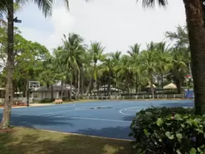 Tropical park with sky-high playground for older kids, toddler playground, fitness trail and stations, pale-lime gazebo, and spiffy basketball courts.