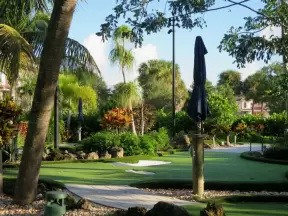 Mini-golf park with lush, colorful grounds, plus arcade games, mini-carousel, and rides.