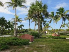 Whitest white sand, clear sparkling water, spacious green lawns with large shade trees, tropical flowers, a wide half-mile boardwalk, and a huge park full of tropical plants.