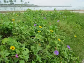 Bluff-top trail full of flowers in the spring. Lovely rugged beach and lagoon below.
