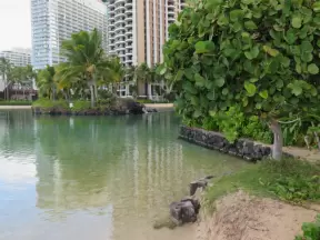 A rock wall protects this area of Waikiki Beach from waves, making it a swimming pool right there at the beach! Also called Kuhio Beach or Kuhio Ponds. Near Waikiki Wall.