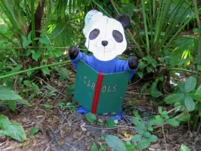 Whimsical sculptures of fairy tale scenes in the middle of a giant oak forest with Spanish moss and vines. Magic!