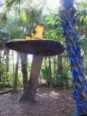 Whimsical sculptures of fairy tale scenes in the middle of a giant oak forest with Spanish moss and vines. Magic!