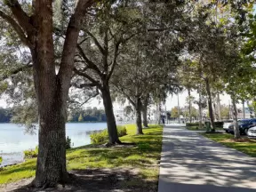 Short walk around shimmering lake with moss-draped trees, past Spanish mansions.