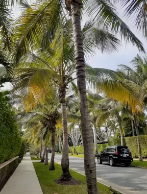 Walk past mansions in the shade of pine and palm trees on Palm Beach Island.