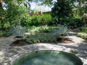 A tropical wonderland of palms, ferns, bromeliads, fountains, sculptures, rocks, ironwork gates, and pergolas, with the delightful scent of flowers filling the air.