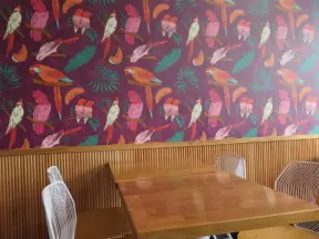 A trendy street in the middle of a sketchy neighborhood, with cafes and colorful graffiti-covered walls.