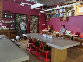 Health food store with great bakery, indoor seating with big windows, and outdoor picnic tables under thick leafy shade.